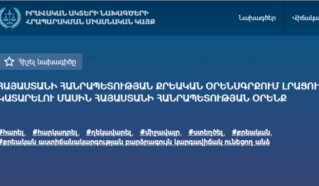 2016թ. հոկտեմբերի 20-ին ՀՀ ազգային ժողովի կողմից երկրորդ ընթերցմամբ և ամբողջությամբ ընդունվել է ՀՀ կառավարության ներկայացրած օրինագիծը «Հայաստանի Հանրապետության քրեական օրենսգրքում փոփոխություններ և լրացումներ կատարելու մասին»: Նշված օրենքով ՀՀ քրեական օրենսգրքի մարդու և քաղաքացու սահմանադրական իրավունքների ու ազատությունների դեմ ուղղված հանցագործությունների գլուխը լրացվում է երկու հոդվածներով, այն է՝ 154.7. և 154.8: Մասնավորապես, երկրորդով պատասխանատվություն է նախատեսվում այլ անձի փոխարեն քվեարկելու վերաբերյալ սուտ հայտարարություն տալու կամ կեղծ ստորագրությամբ հայտարարություն ներկայացնելու համար: